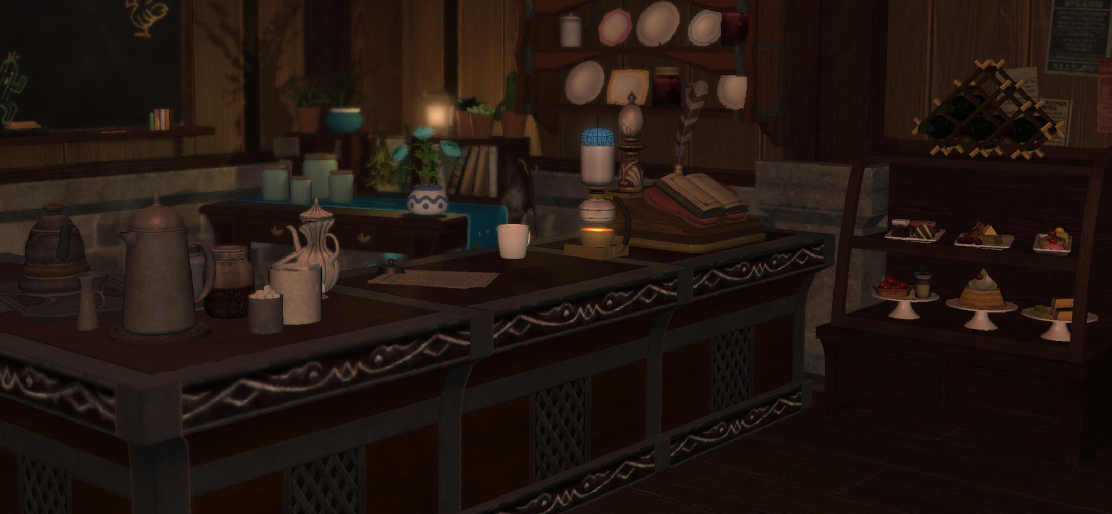 Tucked into a cozy corner of Gridania, we offer a small café setting and library as a brief respite in the quiet moments of the day.Behemoth | Lavender Beds | Ward 25 | Plot 39